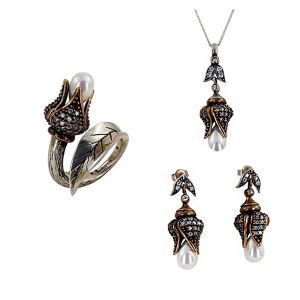 925 ayar gümüş üzerine oksitli ve damla kesim majorka incili, zirkon taşlı otantik bayan gümüş üçlü takı seti. Kolye, küpe ve yüzükten oluşan lale model bayan gümüş üçlü takı seti, zirkon taşlarla mıhlanmış ve damla kesim majorka inci kullanılarak eskitme yapılıp, tamamı 925 ayar gümüşten üretilmiştir. Küpeleri vidalı olarak tasarlanmıştır. Osmanlı dönemi takılarından ilham alınarak tasarlanmış olan bu lale model, damla kesim majorka incili ve zirkon taşlı gümüş üçlü takı setini takmaktan büyük keyif alacaksınız. 925 ayar gümüş, otantik ve lale model, damla incili ve zirkon taşlı gümüş üçlü takı seti her kadının vazgeçemeyeceği şık bir tasarımdır. Her zaman severek kullanabileceğiniz ve sevdiklerinize hediye edebileceğiniz mükemmel bir tasarımdır. Zincir dahil fiyattır. Diğer gümüş otantik üçlü takı seti modelleri ve fiyatları için otantik set kategorimizi ziyaret edebilirsiniz.